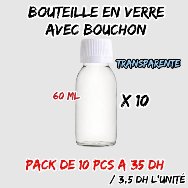 BOUTEILLE EN VERRE AVEC BOUCHON 60 ml TRANSPARENTE { PACK DE 10 PCS A 35 dh }