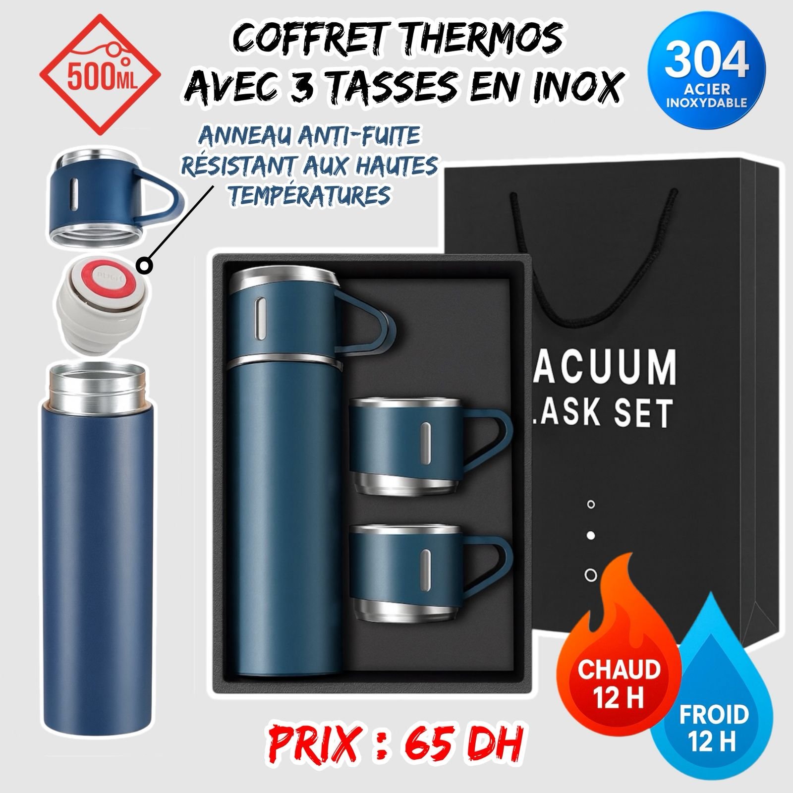 COFFRET THERMOS AVEC 3 TASSES EN INOX { 500ML }