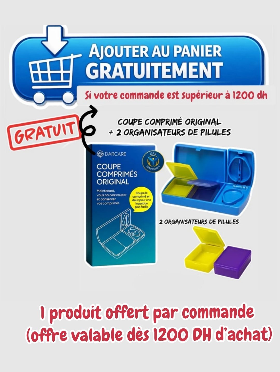 Coupe comprimé original = gratuit.(1 produit offert par commande) *offre valable dès 1200DH d’achat*.