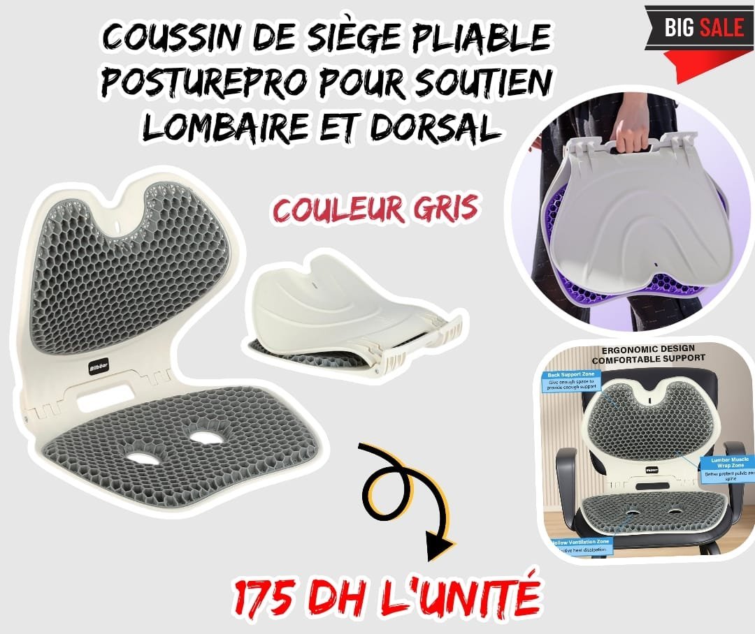 Découvrez un confort optimal avec le coussin d’assise pliable PosturePro, conçu pour les longues heures passées assis au travail, aux études ou à la maison. Ce coussin correcteur de posture pliable est doté d’un rembourrage alvéolé en TPE respirant qui épouse la forme de votre colonne vertébrale tout en offrant un soutien lombaire exceptionnel. Léger et peu encombrant, il convient aussi bien aux adultes qu’aux enfants. Dites adieu aux douleurs dorsales, aux jambes engourdies et à une mauvaise posture grâce à cette solution d’assise innovante qui favorise un alignement naturel de la colonne vertébrale et contribue à prévenir la fatigue lors de longues périodes d’inactivité.
