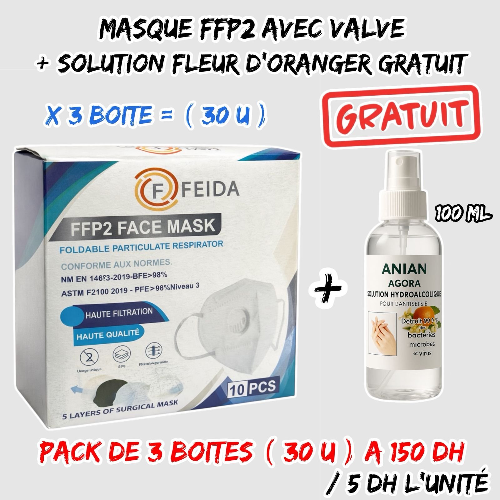 MASQUE FFP2 AVEC VALVE { BLANC } 30U + SOLUTION 100 ML GRATUIT